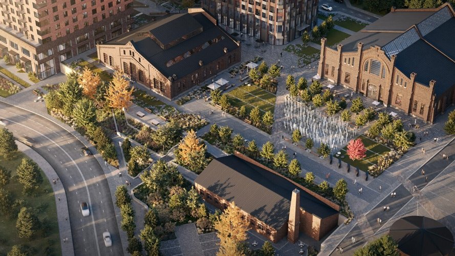 В отреставрированных зданиях мастерских расположен гастрономический центр с фермерским рынком, шопинг-аллея с бутиками, wellness-пространство с бассейном, детский сад "Европейская гимназия" и даже бизнес-центр.