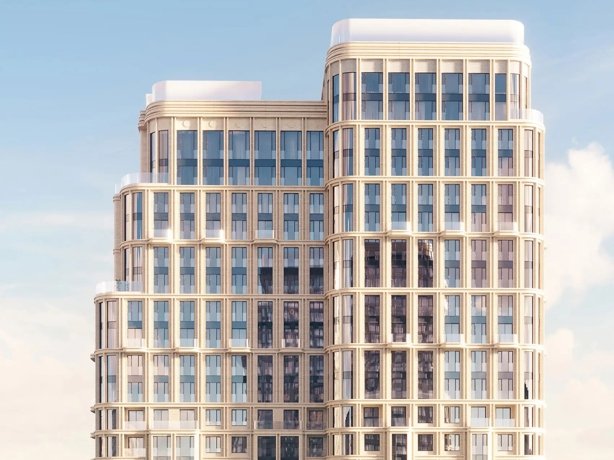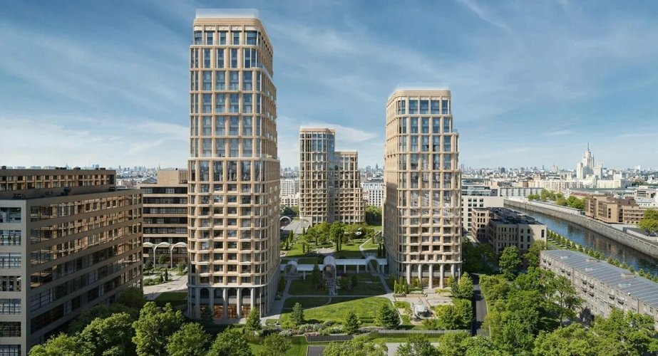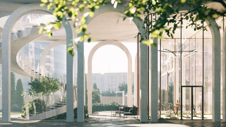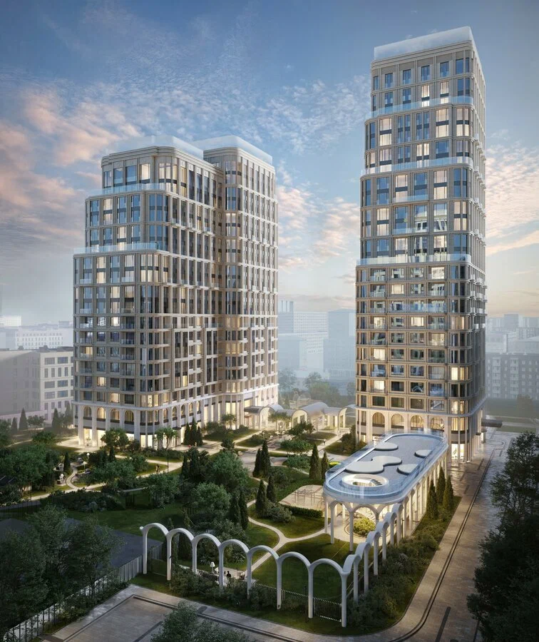 Большие арочные витражи, моллированные окна и плавные линии корпусов создают тот самый эффект «итальянской виллы» в центре Москвы. Дом словно струится, отражая небо и зелень.