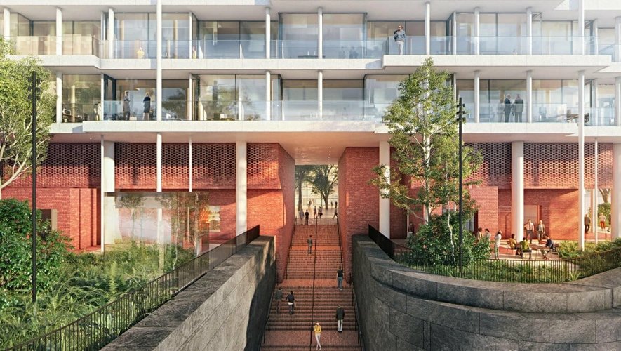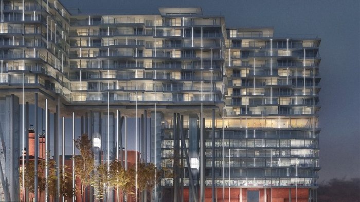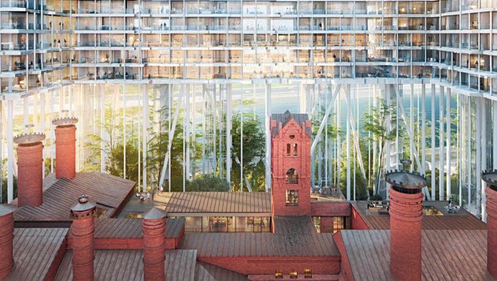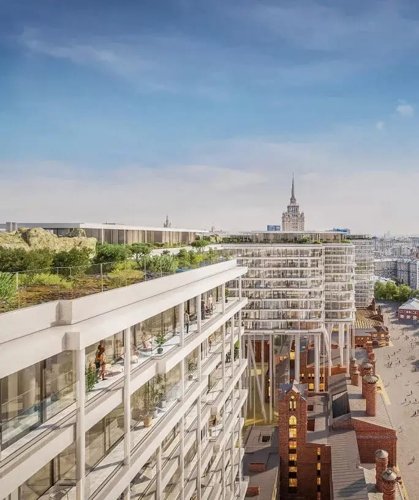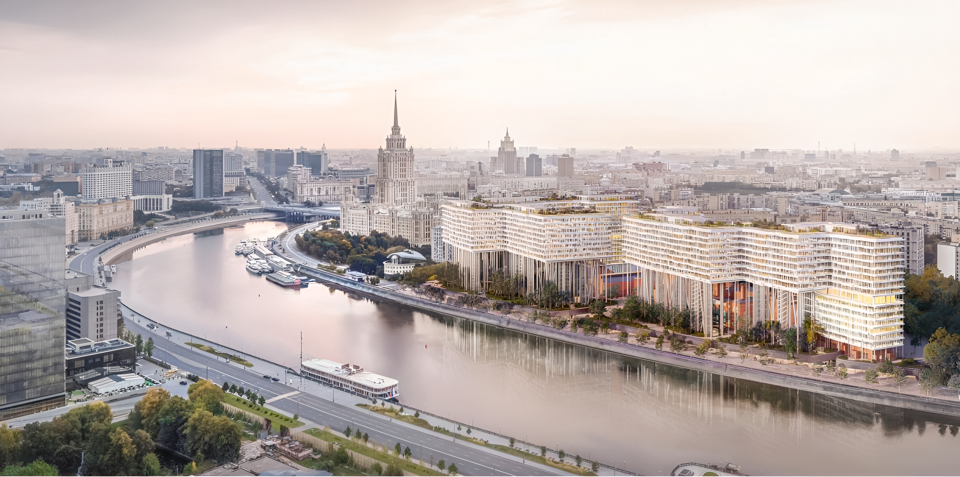 Это манифест новой Москвы, где два корпуса-ленты парят в воздухе на 35-метровых колоннах, открывая городу отреставрированные фасады легендарного пивоваренного завода.