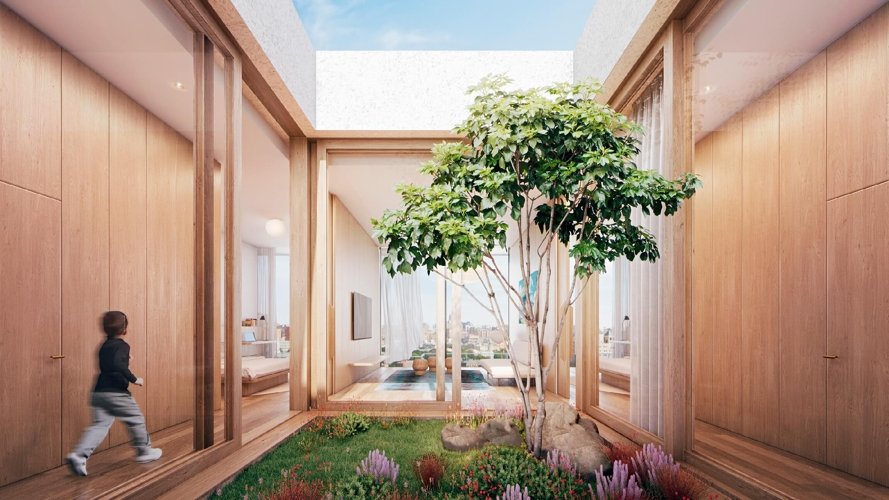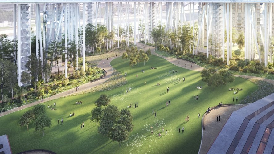 Две жилые «ленты» переменной этажности парят на стальных опорах, создающих эффект невесомости. Это скай-виллы, где каждый день вы просыпаетесь в облаках.