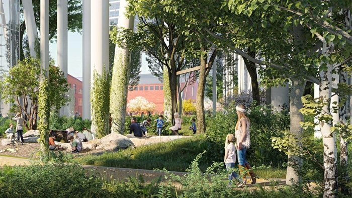 Беговые и велодорожки, лужайки для йоги, детские и спортивные площадки, плодовые деревья и сирень, которая цвестет прямо под вашими окнами