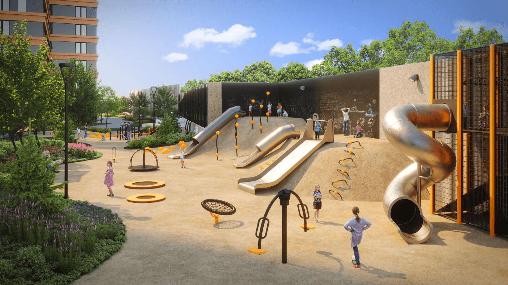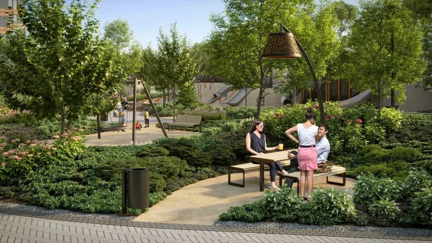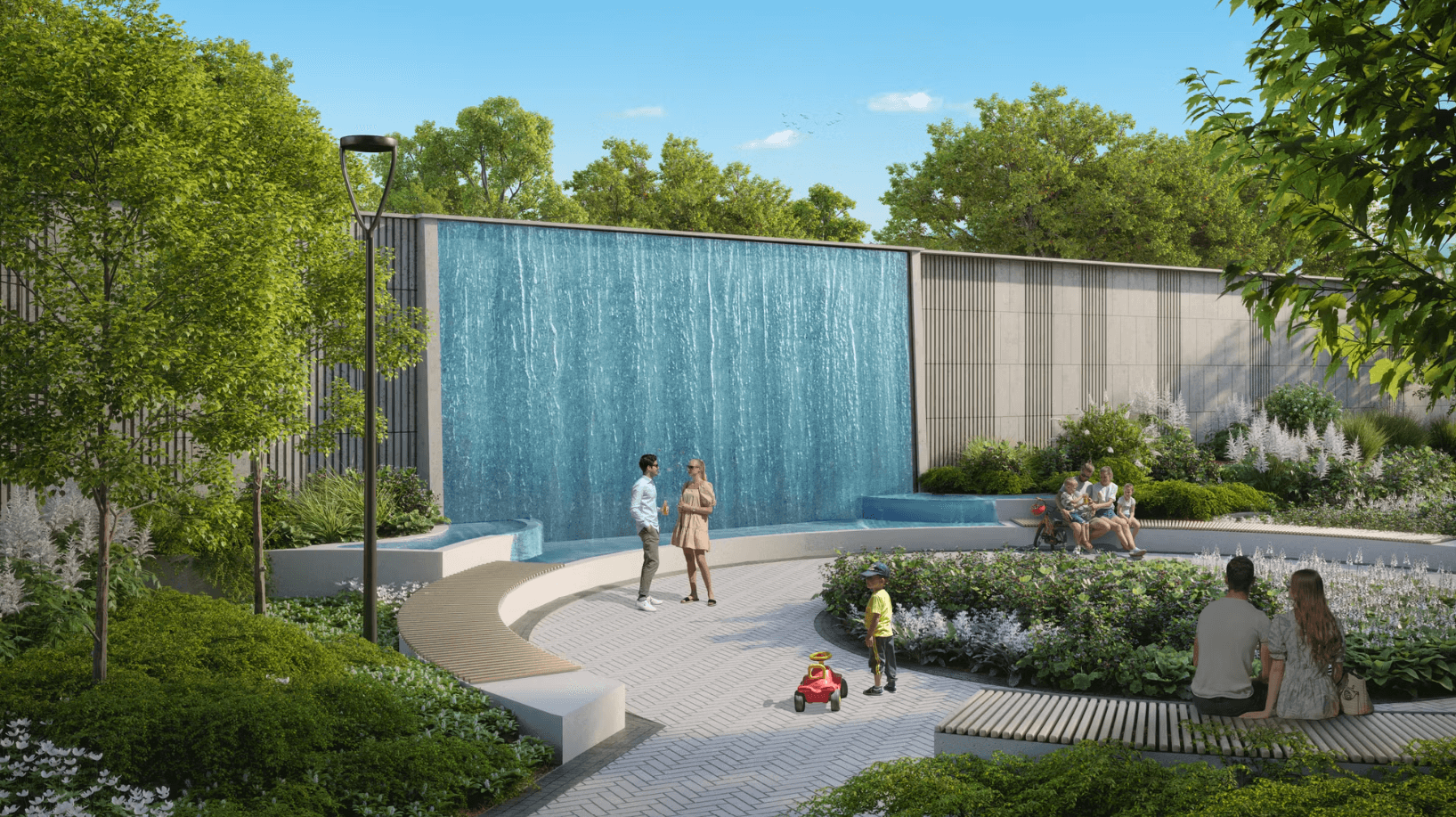 На площади 0,6 га искусственные холмы с крупномерными деревьями, прогулочные маршруты и зоны отдыха. Но сердцем этого пространства является зона отдыха с водопадом-амфитеатром.
