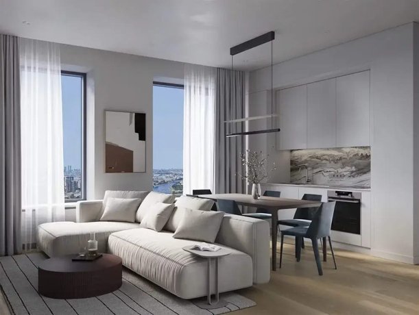 Здесь есть редкие для рынка лоты с мастер-спальнями, отдельными постирочными и гардеробными, с местами под камин и с приватными видовыми террасами. Везде повышенная шумоизоляция, система «Умная квартира» и фильтрация воды.