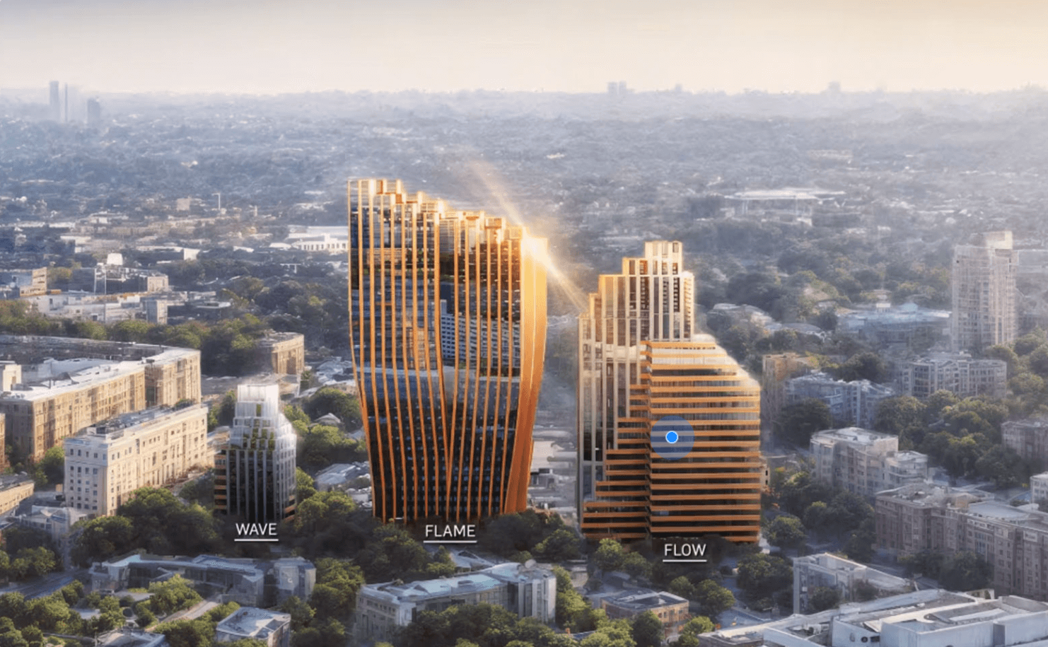 Wave, Flame и Flow (Волна, Пламя, Поток) — их пластичные, изогнутые формы создают сложный геометрический рисунок на фасаде. Это самостоятельные скульптуры, которые приятно рассматривать каждый день.