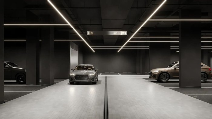 Двухуровневый подземный паркинг с местами для электромобилей, кладовыми и постаматами решает главную проблему любого жителя мегаполиса.