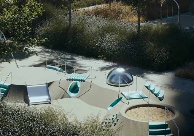 Внутренний двор превращён в ландшафтный парк с дизайнерскими скамьями, креслами и шезлонгами из камня, прогулочными дорожками из гранитной брусчатки и разноуровневыми детскими площадками.