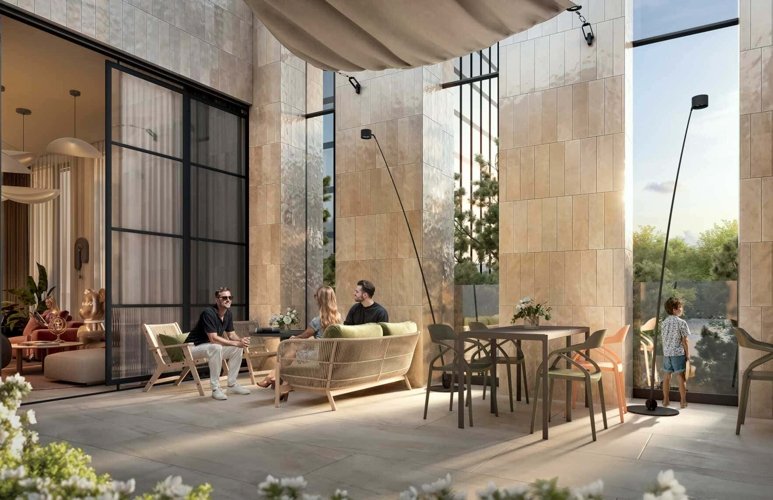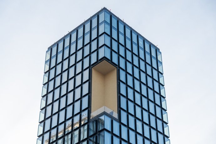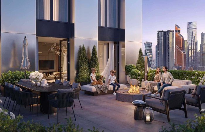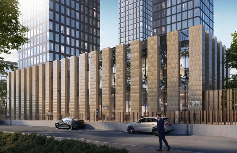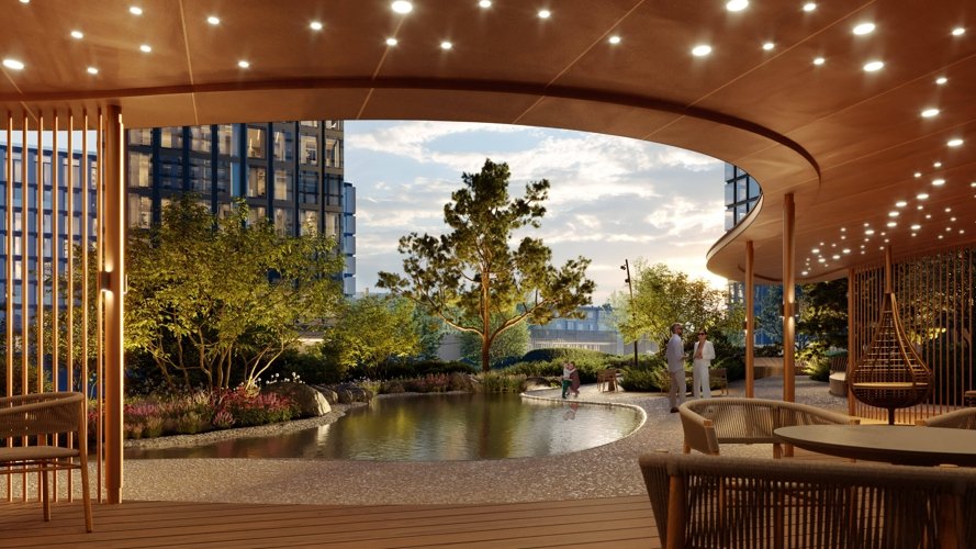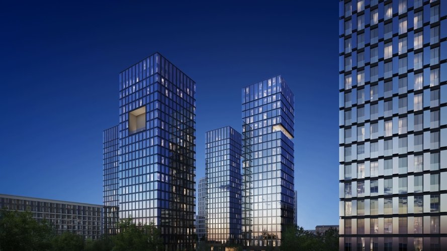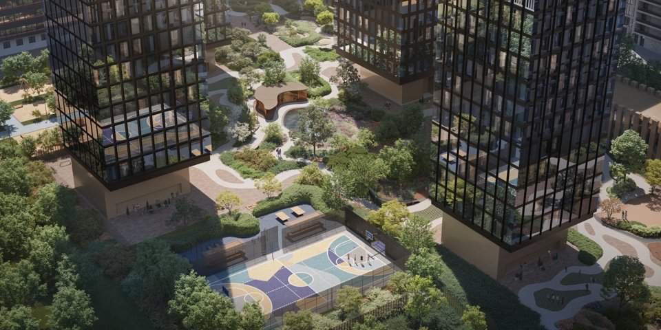 Здесь четыре ультратонкие башни, словно кристаллы, вырастают из земли, а внутри них скрыты высотные лобби Sky Halls — настоящие оазисы на высоте, где вы можете работать, отдыхать и встречать закаты, не спускаясь вниз