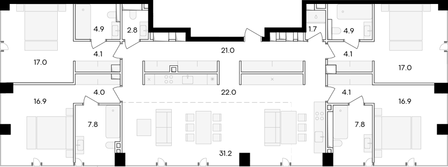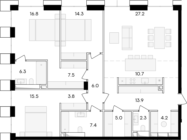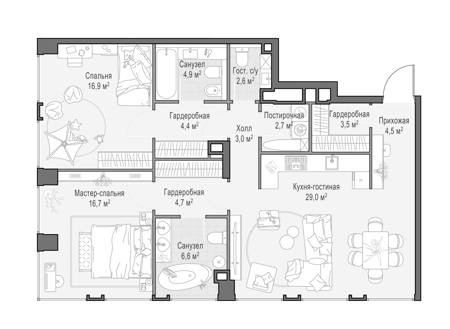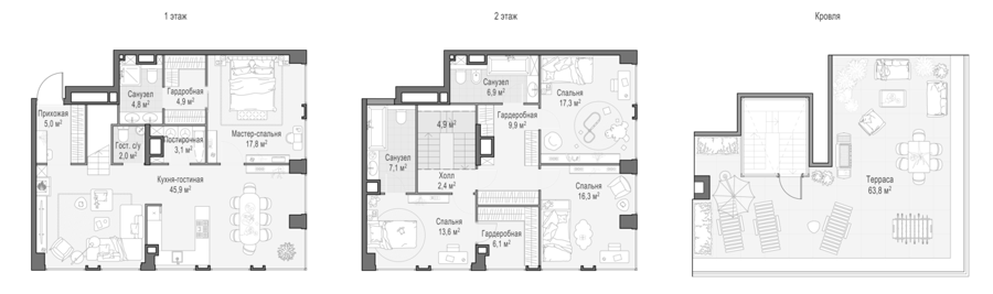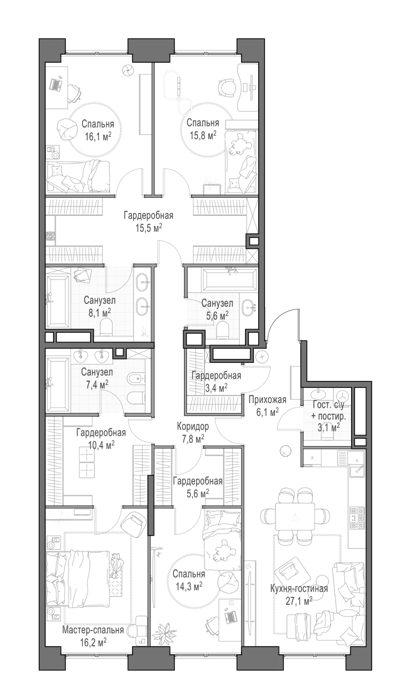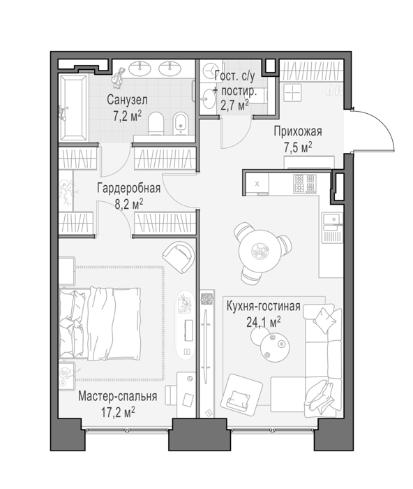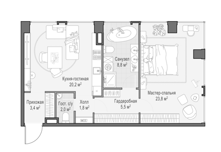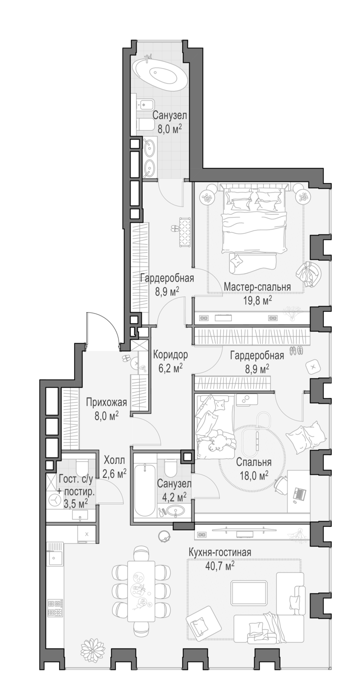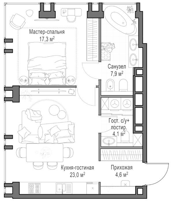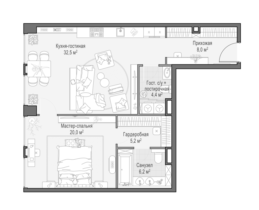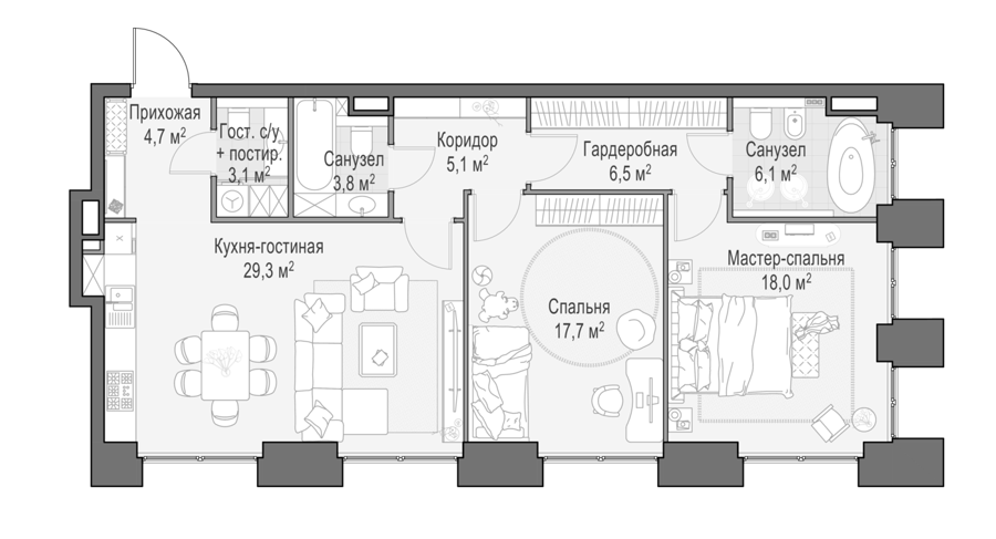 Вы можете приобрести как камерную двухкомнатную квартиру для себя, так и роскошный пентхаус для всей семьи. Формат без отделки — вы создаёте интерьер своей мечты с нуля