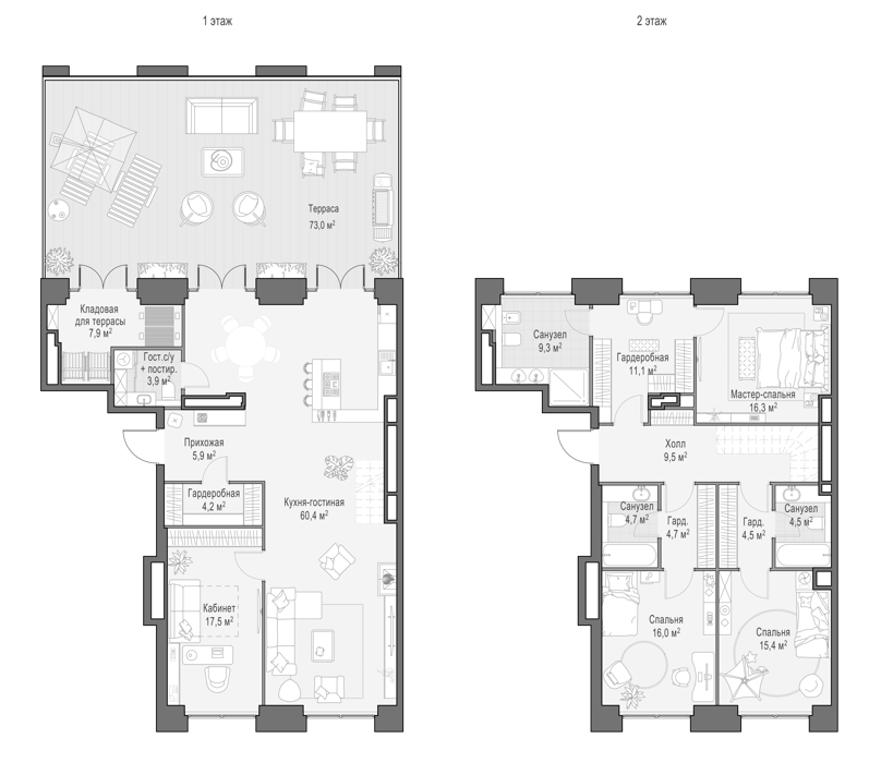 Темные фасады с большим количеством стекла, нейтральная палитра из натуральных материалов, лаконичные формы, которые не подвластны сиюминутным трендам. Ваш дом выглядит современно и статусно